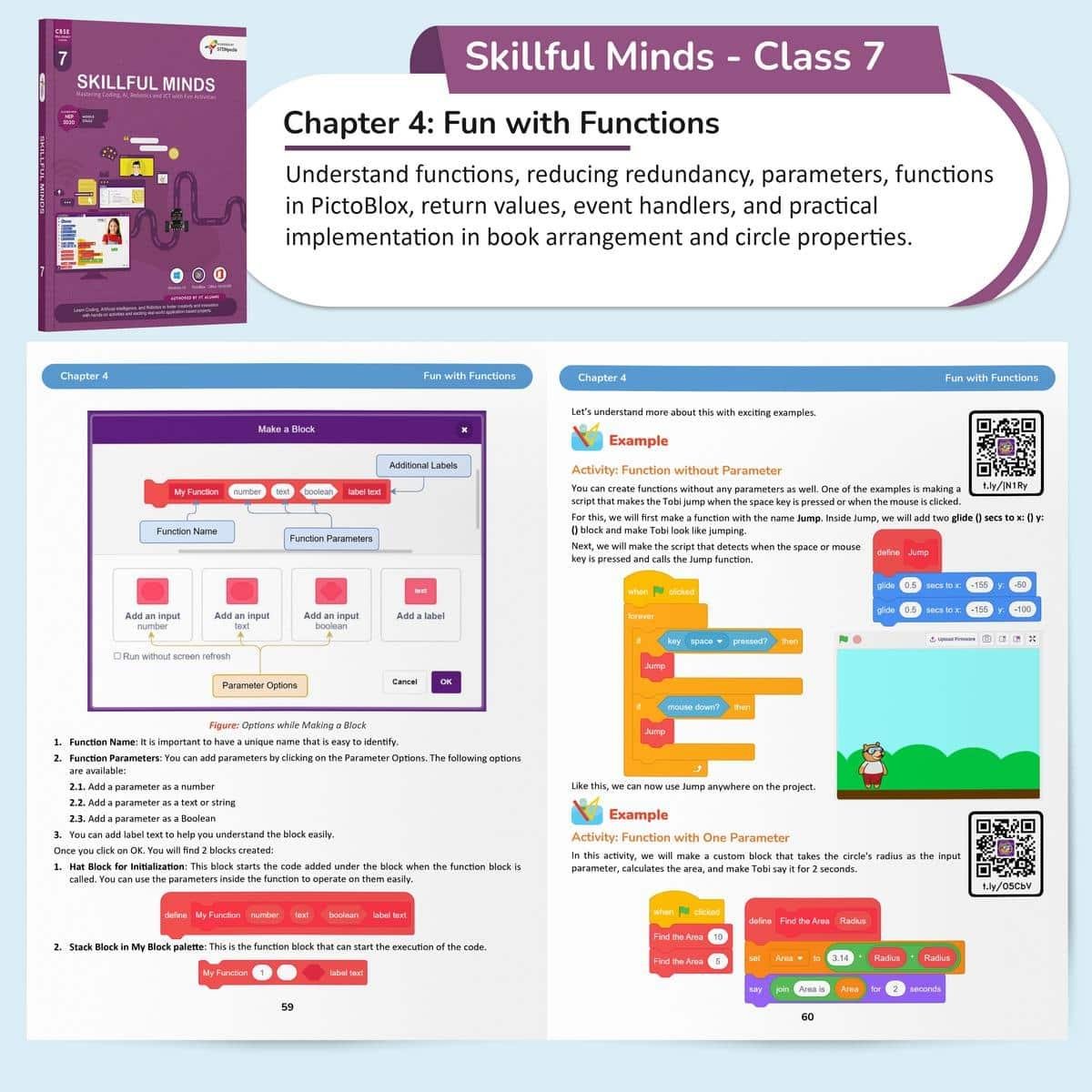 Skillful Minds for Class 7 is a complete and engaging educational resource designed to deepen studentsunderstanding of Information and Communication Technology. Aligned with the CBSE curriculum and the Class 7 Coding Skill Subject (Chapters 2), the book covers key areas such as coding, algorithm development, advanced MS Office tools, fundamentals of Artificial Intelligence and Robotics, and introductory HTML. All topics are reinforced through hands-on lab activities that encourage real-world application and interactive learning.