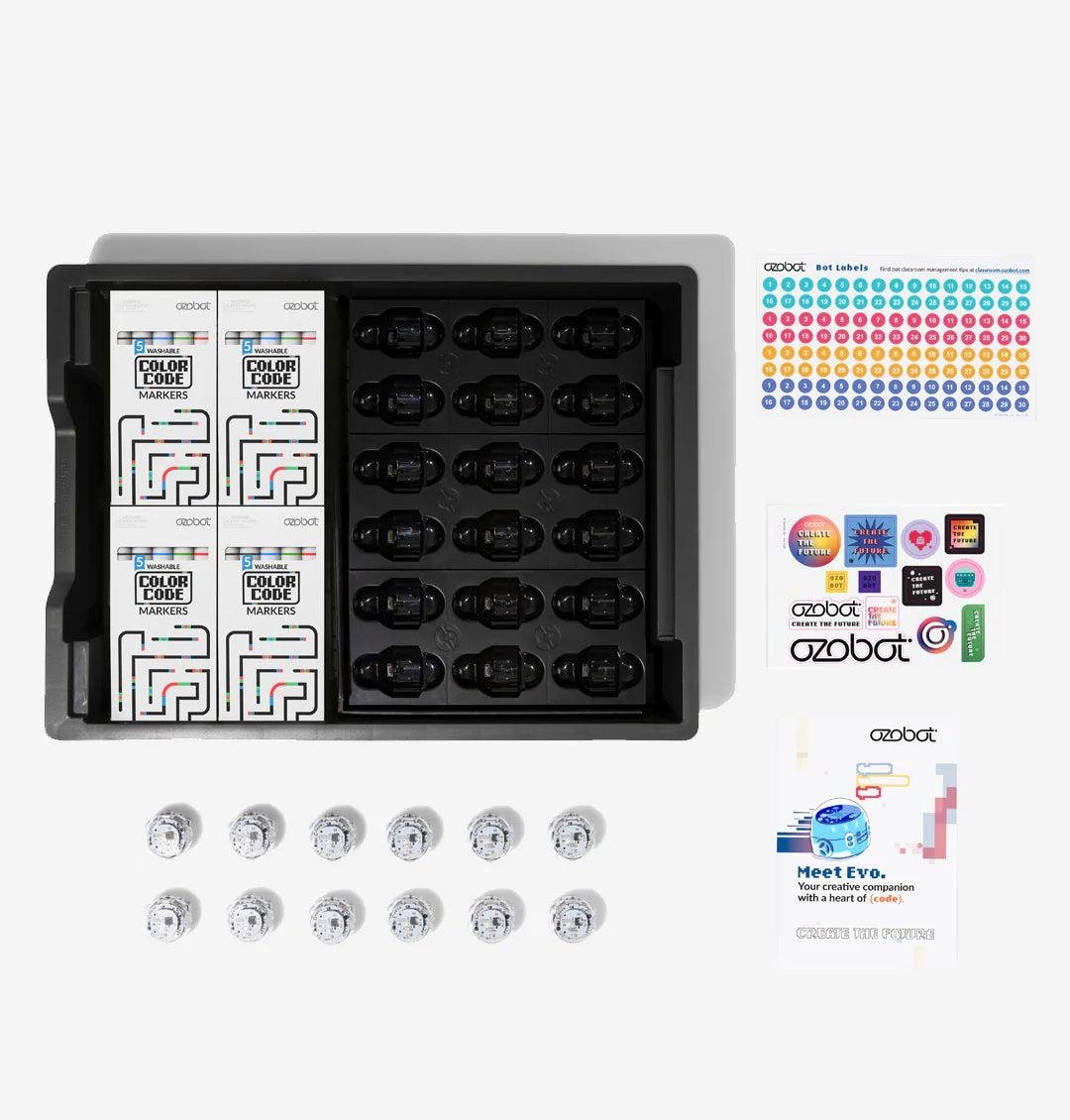 - omplete Classroom Solution: The kit includes 12 Evo robots, dual-tip Color Code marker packs, a charging cradle, and all the guides and stickers needed to get started. It a ready-made resource to integrate coding into your classroom seamlessly.